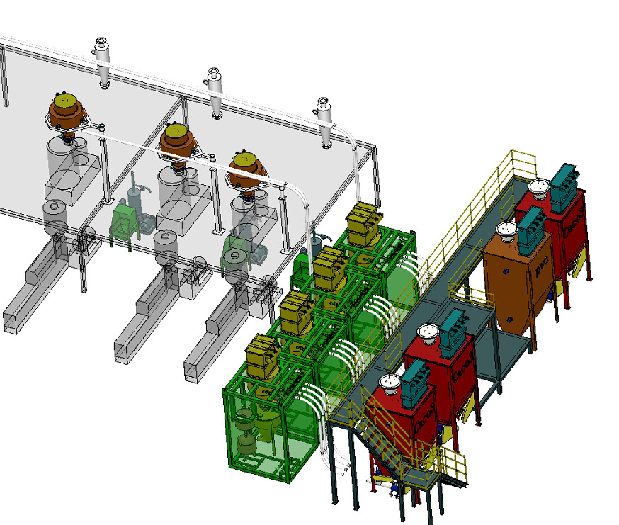 多層廠房采用一次輸送方式,即物料從原料倉輸送至計量磅秤后靠自重垂直落入攪拌機內;單層廠房采用二次輸送方式,即物料從原料倉輸送至計量磅秤后,再從計量磅秤輸送至上料單元后靠自重垂直落入攪拌機內。若客戶的生產工藝流程有其他特殊要求,我公司可以根據客戶實際需求做出相應調整。