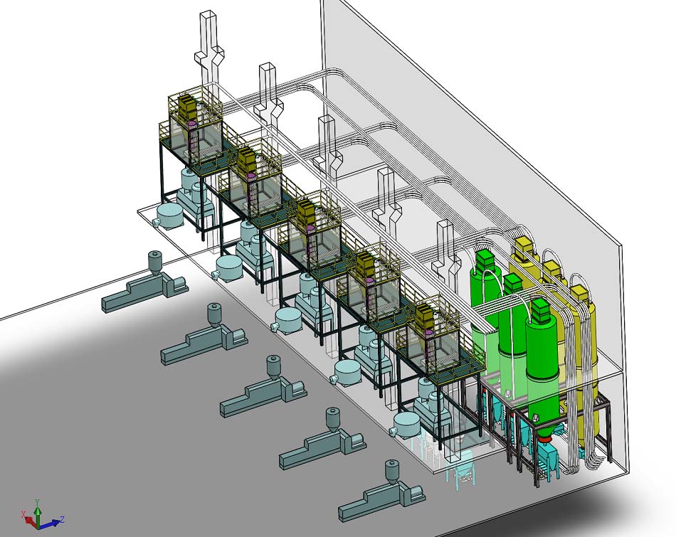 本產(chǎn)品為多種原料配方自動計量磅秤,該上料輔機系統(tǒng)將原料區(qū)與生產(chǎn)區(qū)分離,采用真空吸引輸送技術(shù),幫助客戶降低設(shè)備及建筑成本,減少人工,并實現(xiàn)清潔生產(chǎn)。該系統(tǒng)采用中央控制體系,技術(shù)員可于中控箱的操作面板上直接控制、檢查全套設(shè)備的工作情況。